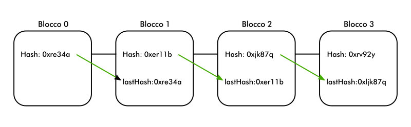 Proprio grazie al collegamento generato dall’ultimo hash, viene formata la catena di blocchi, ovvero la cosiddetta blockchain.